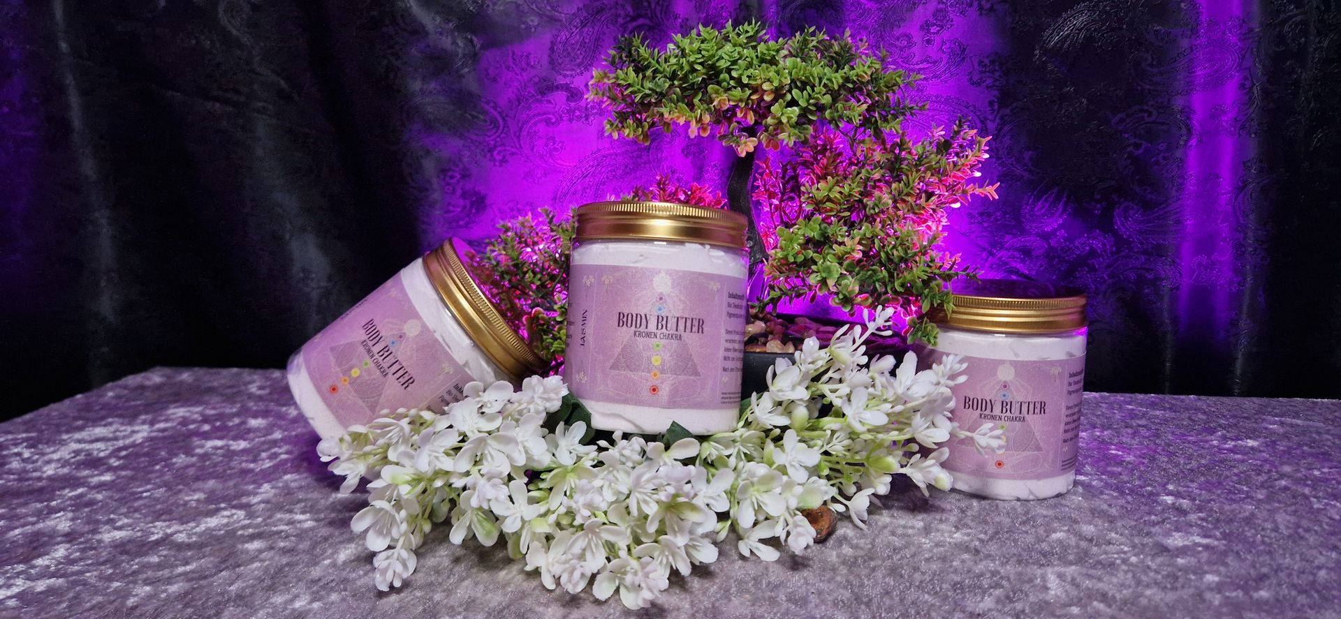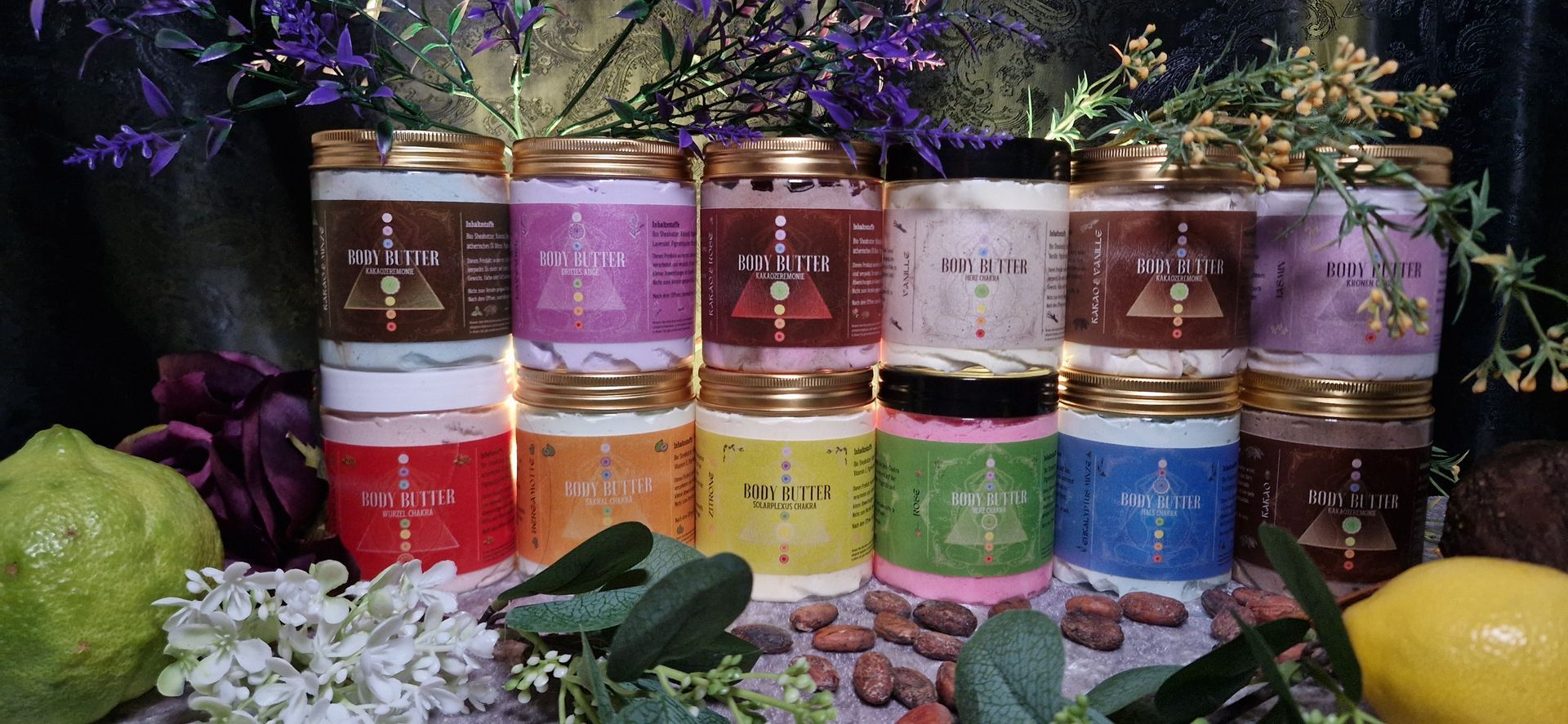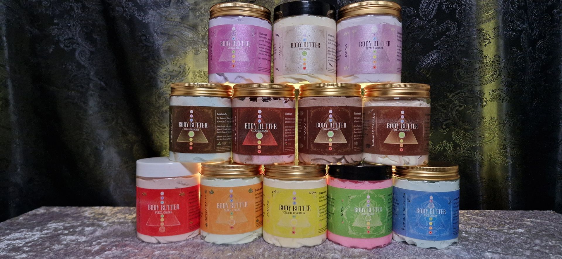 Chakra-Bodybutter-Creamy, ist eine speziell, auf die sieben Chakren abgestimmte, intensive Pflegecreme, für die Haut, die reich an Nährstoffen und Feuchtigkeit ist. Es besteht aus vier verschiedenen Hauptölen und die von mir ausgesuchten, zu den Chakren passenden, ätherischen Ölen.
